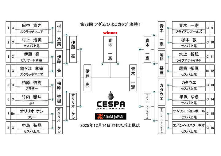 RUNNER-UP:エバンヘリスタ キオ 様(C/セスパ上尾) ★ ADAM JAPAN 協賛キュー進呈! |